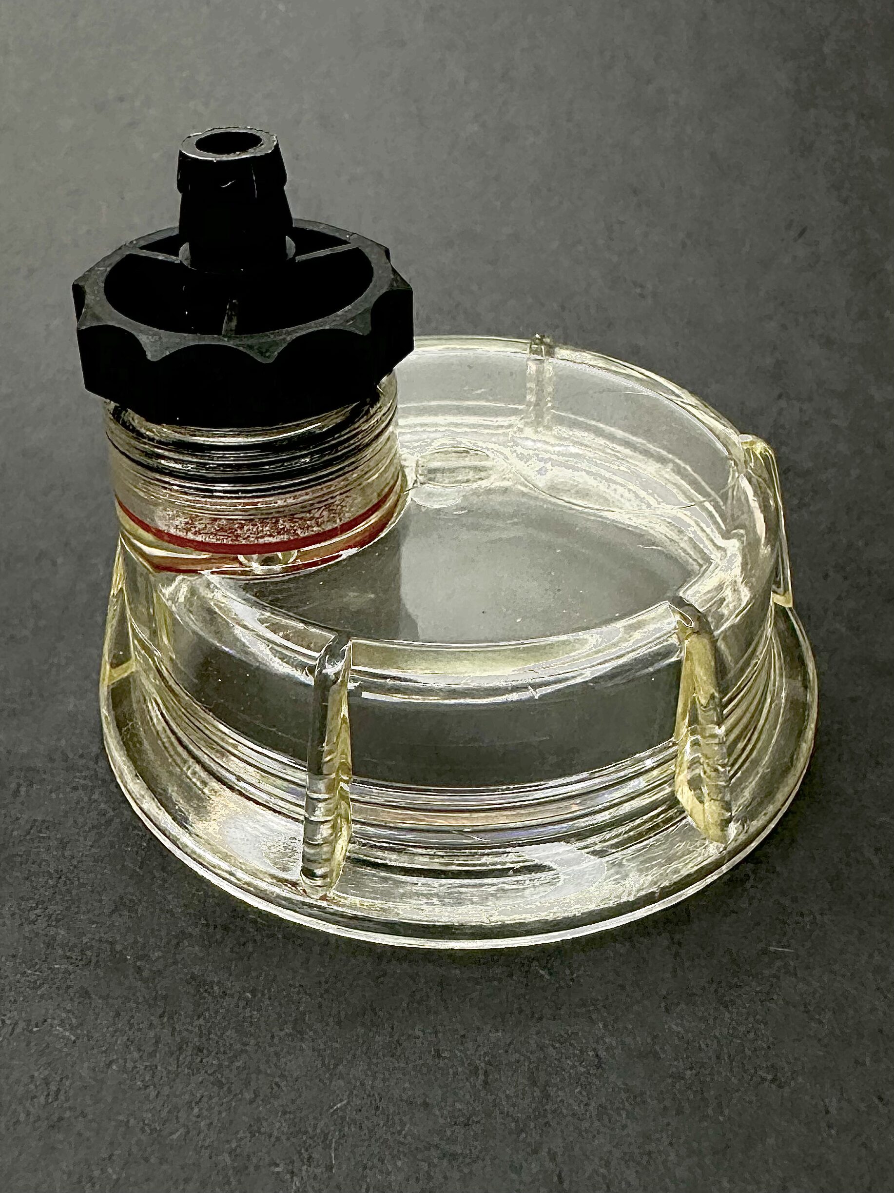 Replacement clear bowl with drain for the two-piece fuel filter assembly. Allows quick visual inspection of fuel quality and easy draining of water or debris to maintain clean, efficient fuel delivery.