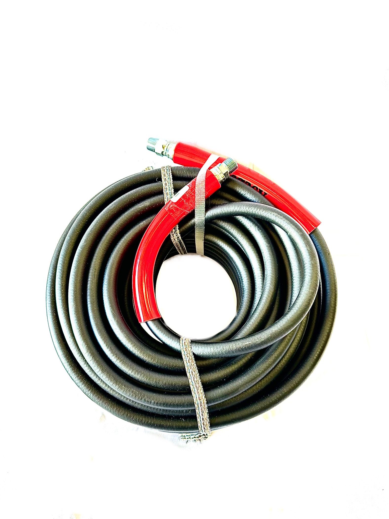 100 ft high-abrasion-resistant hose with fittings. Designed for long life under demanding conditions. Provides flexibility while withstanding heavy wear.