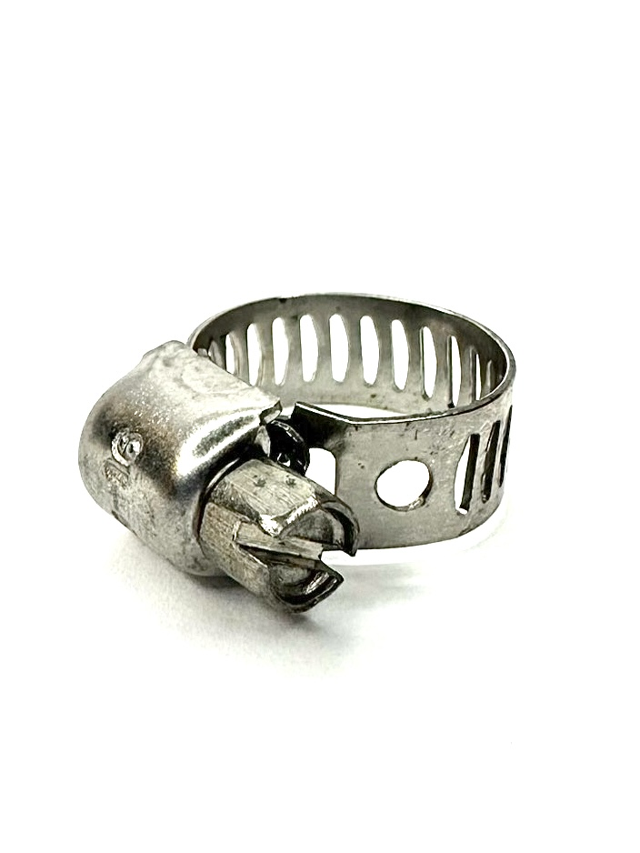 Micro-size stainless steel hose clamp. Provides a tight, corrosion-resistant seal for small hose connections.