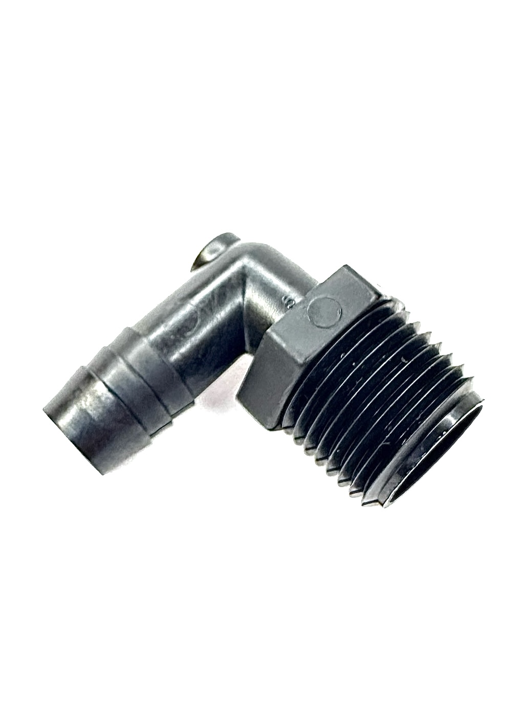 One-piece 90° male elbow with 1/2″ barb and 1/2″ MPT connection. Provides a tight, durable fit for directional hose routing in Kem-O-Kleen systems, reducing strain on lines and fittings