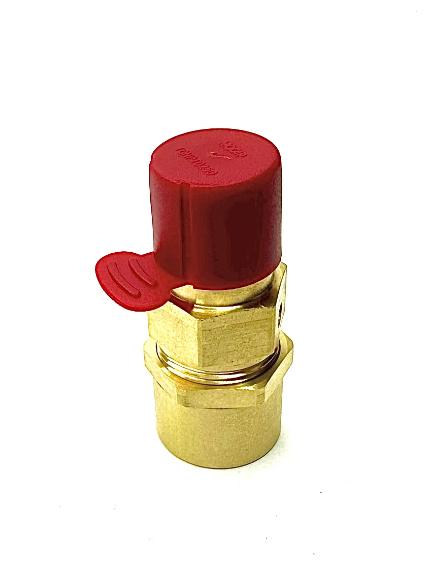 Safety valve used on the compressor assembly to automatically release excess air once system pressure reaches the set limit. Designed to maintain safe and consistent operation of Kem-O-Kleen units under normal working conditions. Must be adjusted to the correct setting during installation—maximum recommended operating pressure is 40 PSI.